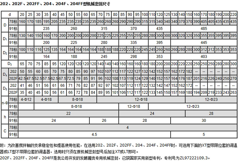 >>适用工况:202、204 适用于各种弱腐蚀介质,密封泄漏要求不严的场合。使用时需在润滑盒中加注润滑油,水等干净液体进行润滑(202可承受一定的负压);202F、204F适用于各种无液体润滑工况下的轴封,如发酵罐,霉菌罐,反应釜等。202FF、204FF对开静环式,常用于较大轴径情况下,在不拆减速机搅拌轴的情况下就可更换静环。其他同202F、204F。